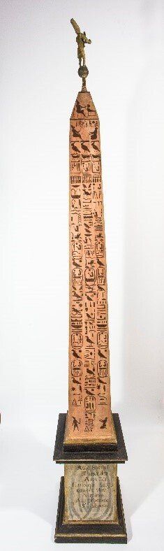 Modello che rappresenta in scala ridotta l’originale detto Flaminio, collocato in piazza del Popolo, lungo il tracciato dell’antica via Flaminia. È realizzato in legno di pioppo dipinto con geroglifici che riproducono quelli dell’originale, in colore bruno su fondo chiaro. Il fastigio, in gesso color ocra, è costituito da una punta che sorregge una piccola sfera su cui poggia una statuetta che sembra raffigurare un faraone con tiara dell’Alto Egitto. Il piedistallo ligneo ha forma di parallelepipedo con cornici nere e riquadrature in oro su fondo chiaro con effetti di finto marmo. Le iscrizioni riproducono quelle dell’originale su tre dei quattro lati.